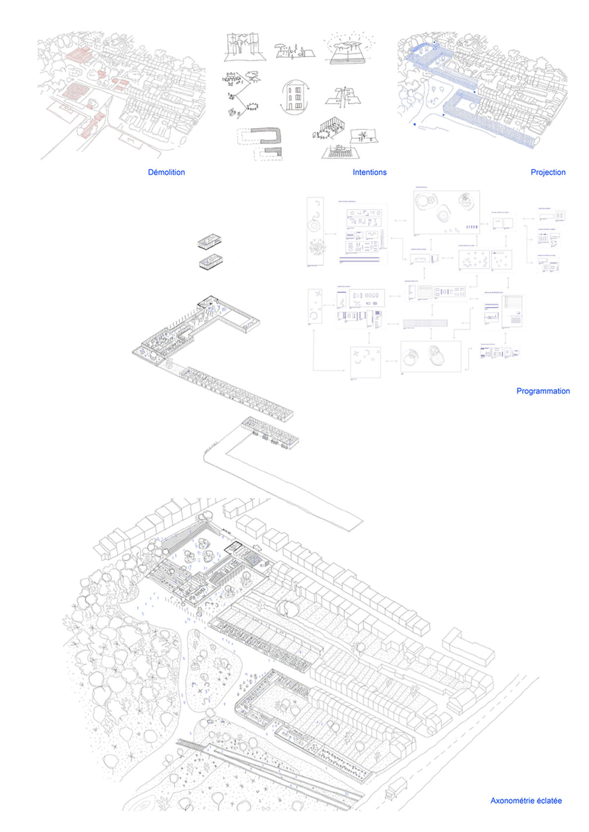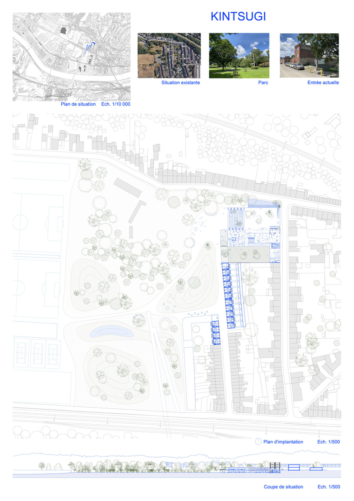 Le projet KINTSUGI prend place au cœur du parc Halkin à Sclessin, exploitant la topographie du site pour se déployer sur plusieurs niveaux. Ce projet vise à ramener des activités essentielles au parc, telles qu’une bibliothèque, une maison des jeunes et un centre culturel, en réunissant ces trois acteurs pour favoriser une collaboration collective, tout en préservant leur indépendance. En réalisant ce projet, nous créons trois véritables entrées au parc. De plus, un pôle Horeca et un atelier vélo seront développés, en lien avec une passerelle qui connectera Cointe à la Meuse.