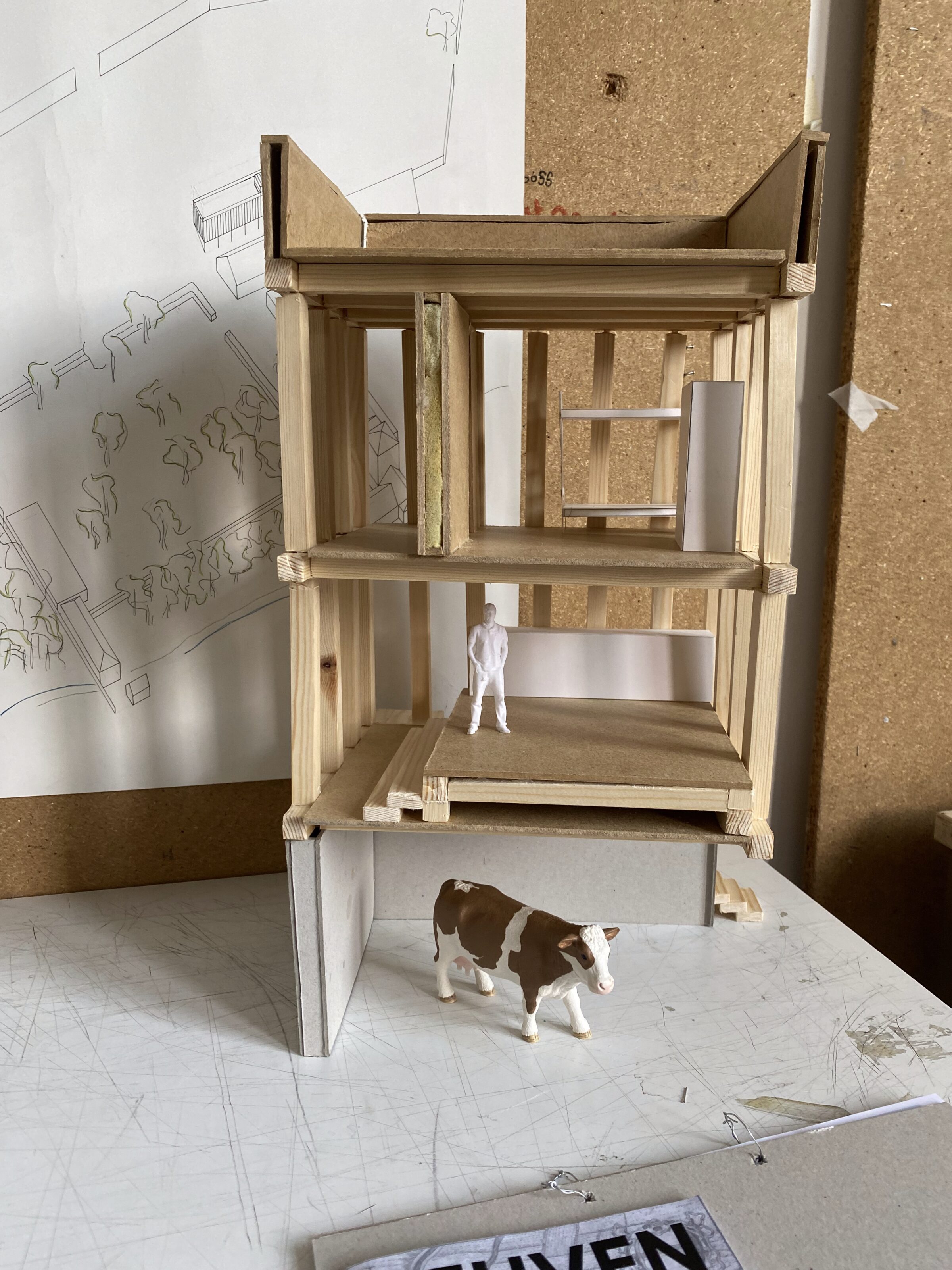 Le projet s’implante juste au-dessus de l’étable pour deux raisons majeures : la première est que celui-ci ne prendra pas de place sur des terrains déjà utilisé pour l’agriculture (serres, champs, verger), et qu’il travaille donc avec l’existant. La deuxième raison est que le projet pourra profiter de gains thermiques provenant de la chaleur des vaches.