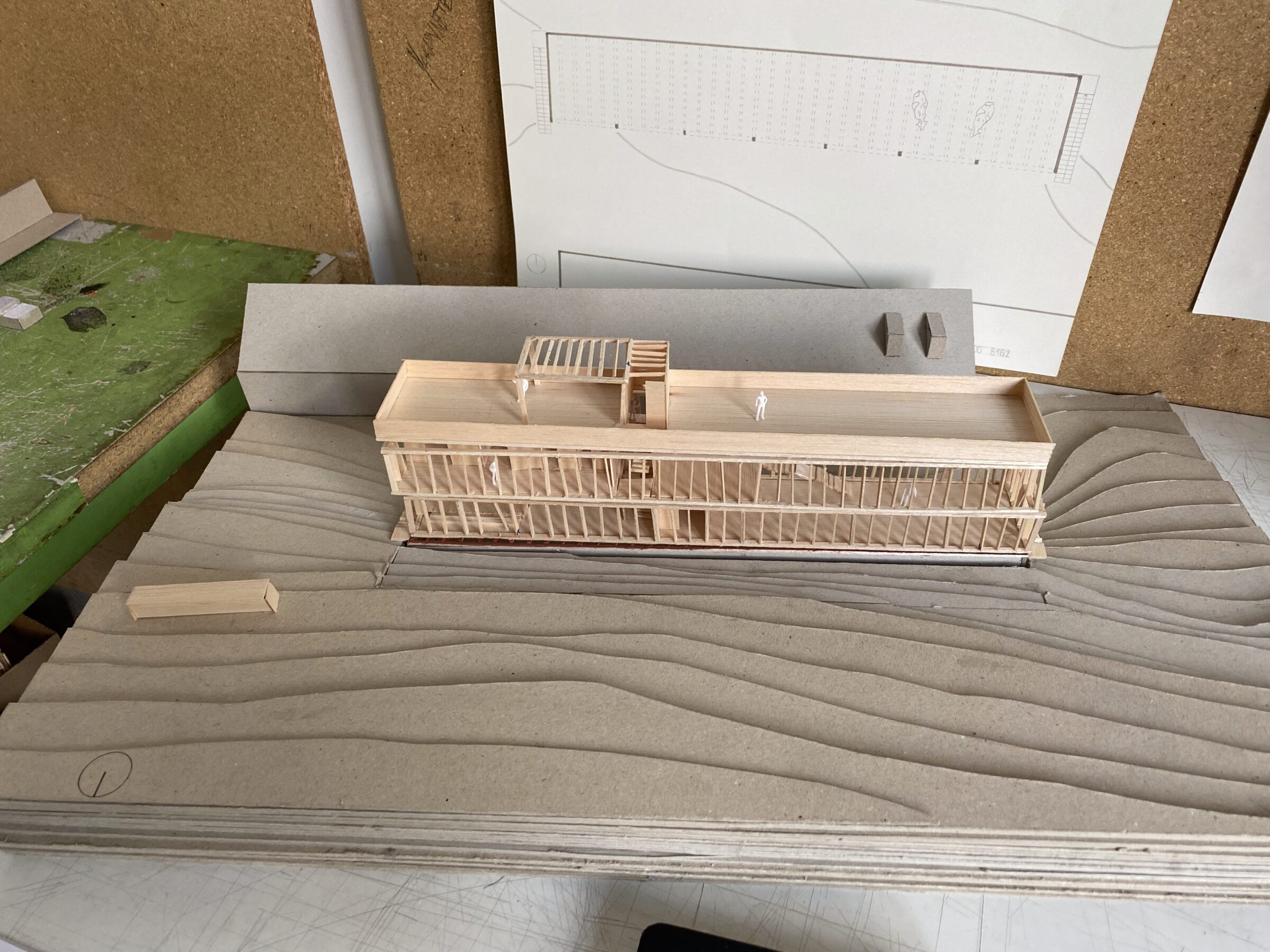 Le principal matériau utilisé pour le bâtiment est le bois car c’est un matériau durable et soutenable. Il est également léger, ce qui permet d’être soutenu par l’étable qui est faite en béton et en bois.
