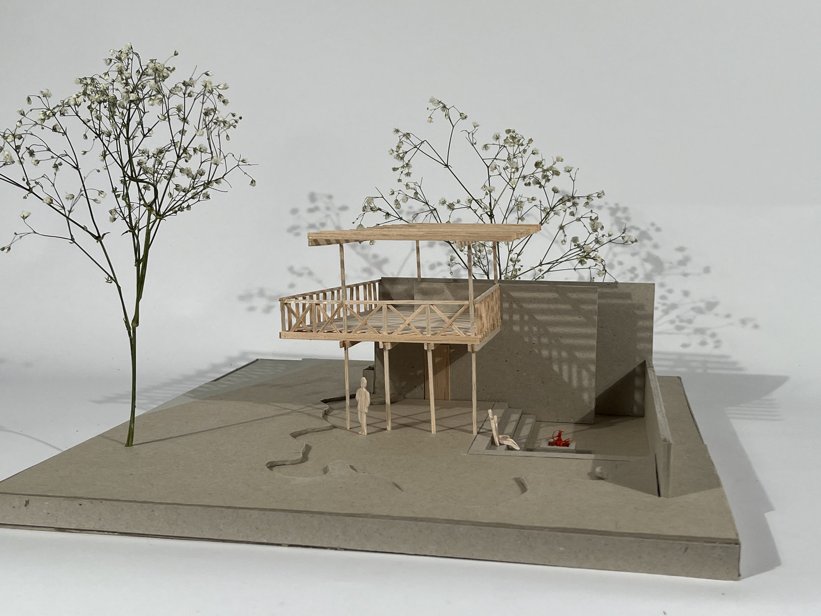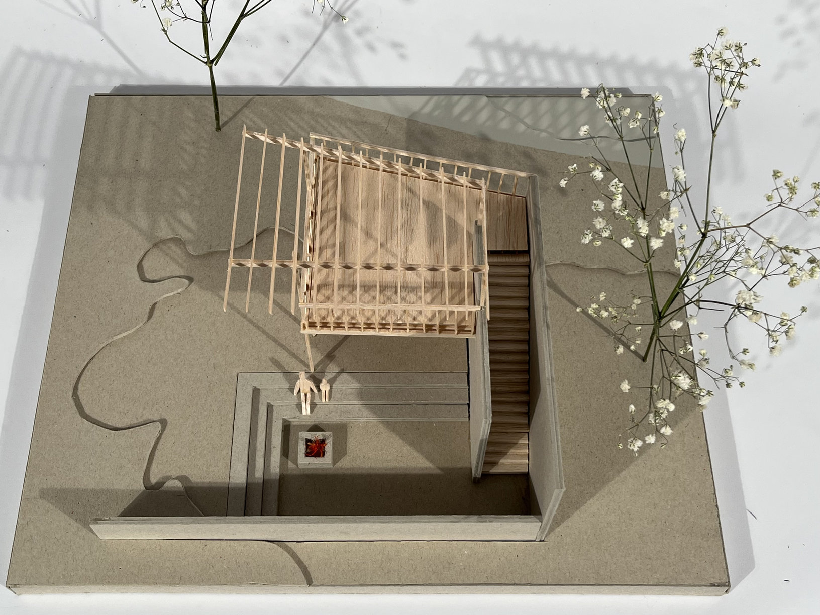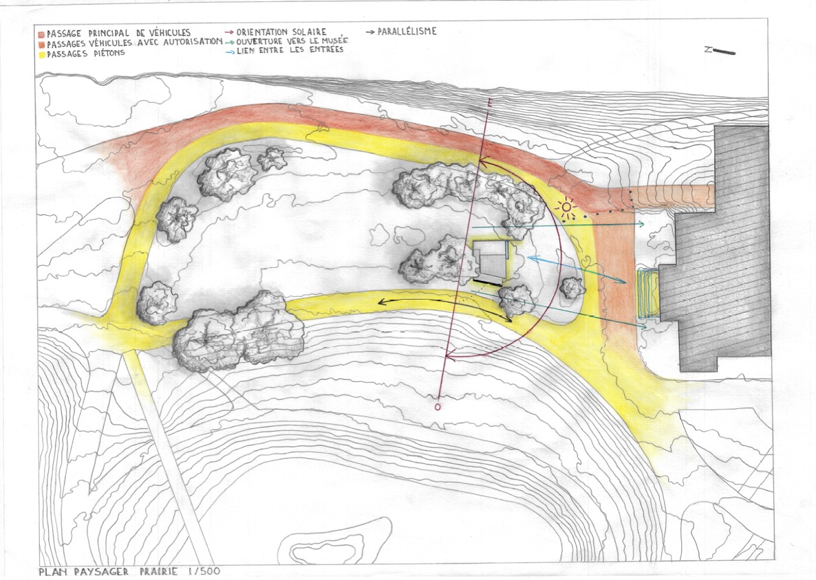 Ce pavillon est en lien direct avec son environnement, notamment le musée et les cheminements piétons. Son orientation tient compte de l’ensoleillement, et l’ensemble vise à créer un lieu de rassemblement convivial.