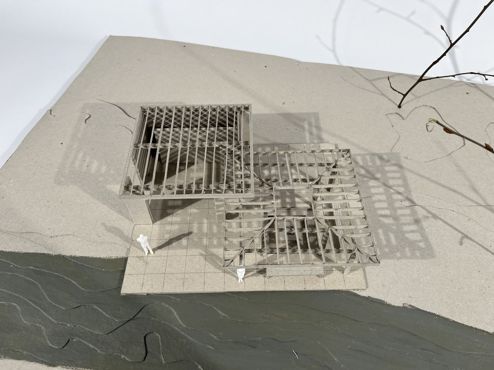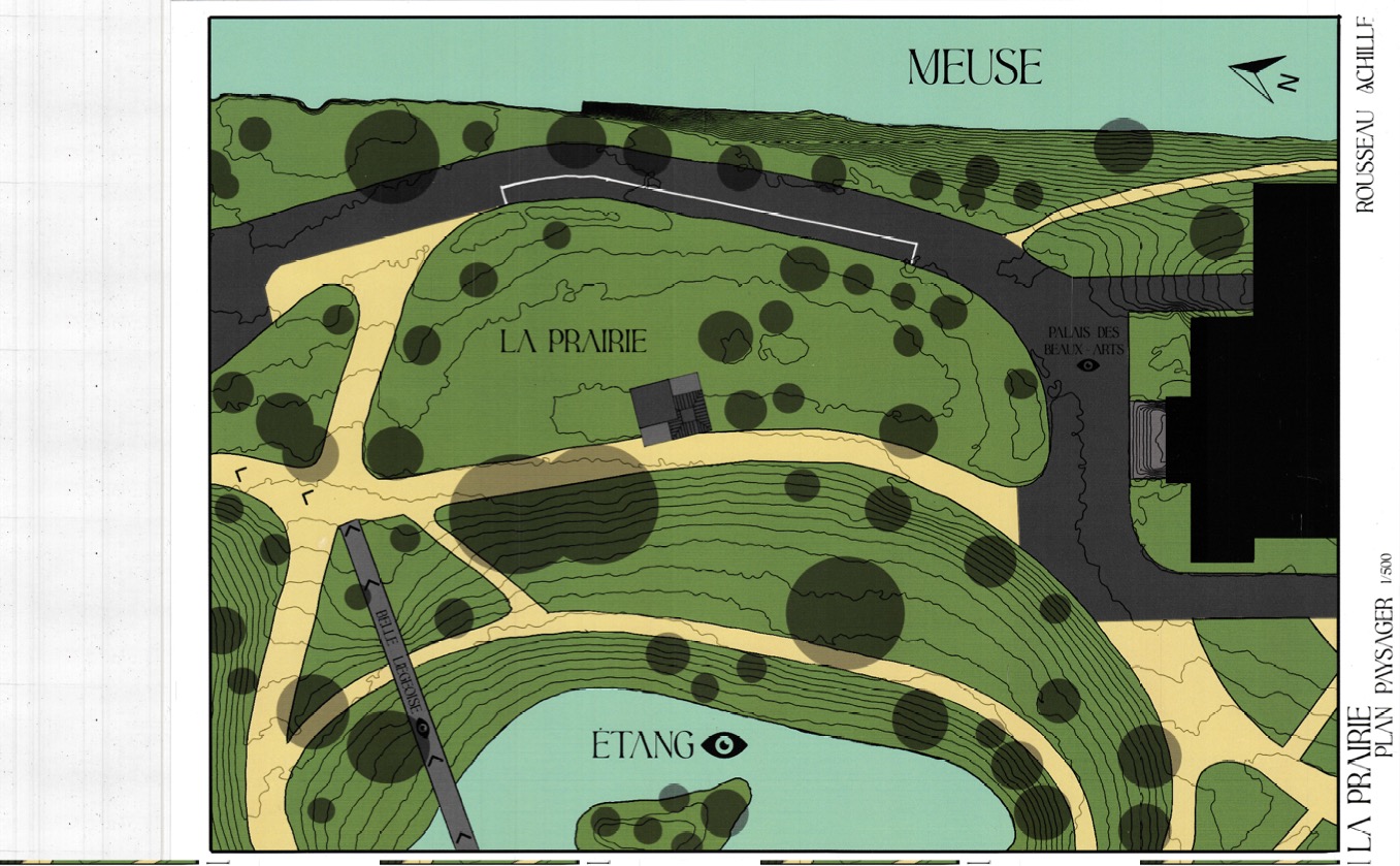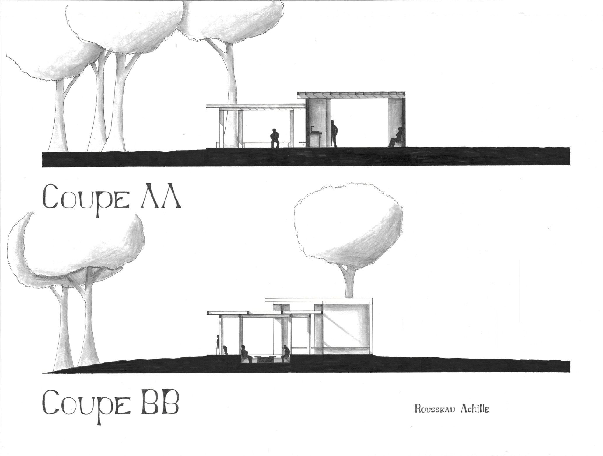 Situé au cœur du parc de la Boverie à Liège, ce pavillon de loisir et de détente s’organise autour d’un fire pit central, favorisant les rencontres. Il repose sur une dalle en béton tramée, positionnée en bordure d’un chemin pour assurer accessibilité et intégration paysagère.